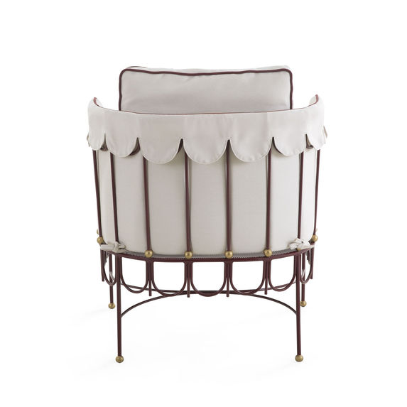 Elora Armchair blends playful detailing with refined craftsmanship. A sculptural metal frame with delicate curves and brass accents supports a softly upholstered seat, while the scalloped back detail adds a distinctive, decorative touch. Contrasting piping outlines the cushions, enhancing its tailored yet whimsical character.